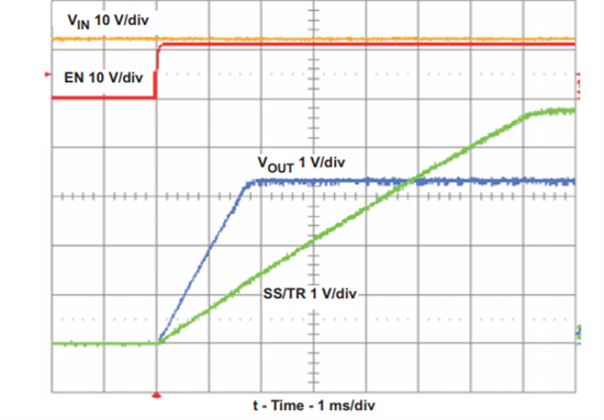 补充一个上面12V转5V正常工作时的时序,黄色是Vin和EN,12V,浅蓝色是SS/TR,深蓝色是5V Vout。