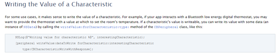 apple官方的core bluetooth API只提供API读取BLE的ADVERTISEMENT DATA和CHARACTERISTICS DATA,如果想通过iOS app来写入BLE的某个CHARACTERISTICS值应该怎么实现?TI有相关的iOS API么?还是我必须用C来实现写CHARACTERISTICS值的功能,再通过iOS app来调用?