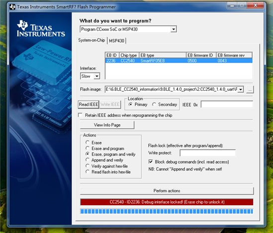 开始是好的,后来读取IEEE就报错,(CC2540 - ID2236: Debug interface locked! (Erase chip to unlock it))
