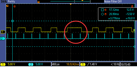 奇怪,确实是没有触发中断。其他都能触发,看着信号都是一样的。只能解释为你触发的时间不够引起的了。放大这个触发信号看看