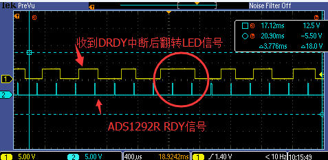 我这个示波器图中根本没有读取ADS1292的数据,只是接收到中断后翻转LED。外部中断是由ADS1292R的DRDY引脚的下降沿触发
