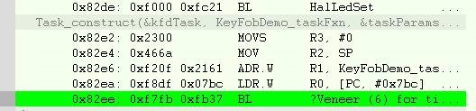 我基于KEYFOB的例程改了一个程序,在CC2650EVM-7ID的开发板上能够正常跑。我想把程序移植到我自己坐的4XS的板子上,改了board.h,也在Preprocessor里面把7ID改成了4XS。但是在调试的时候发现程序走到Task_Construct()这里的时候出了问题,没能成功建立任务。在IAR的调试界面里我点step into那个建立任务的子函数,截了Assembly中对应的汇编码: