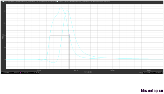 在调节电荷泵时,在PFD输入端加相同信号时,PFD产生一个相同的脉冲信号,脉冲宽度为450pS左右,查看CP的充放电电流是否一致,电荷泵的电流大致一致,但是有延迟。