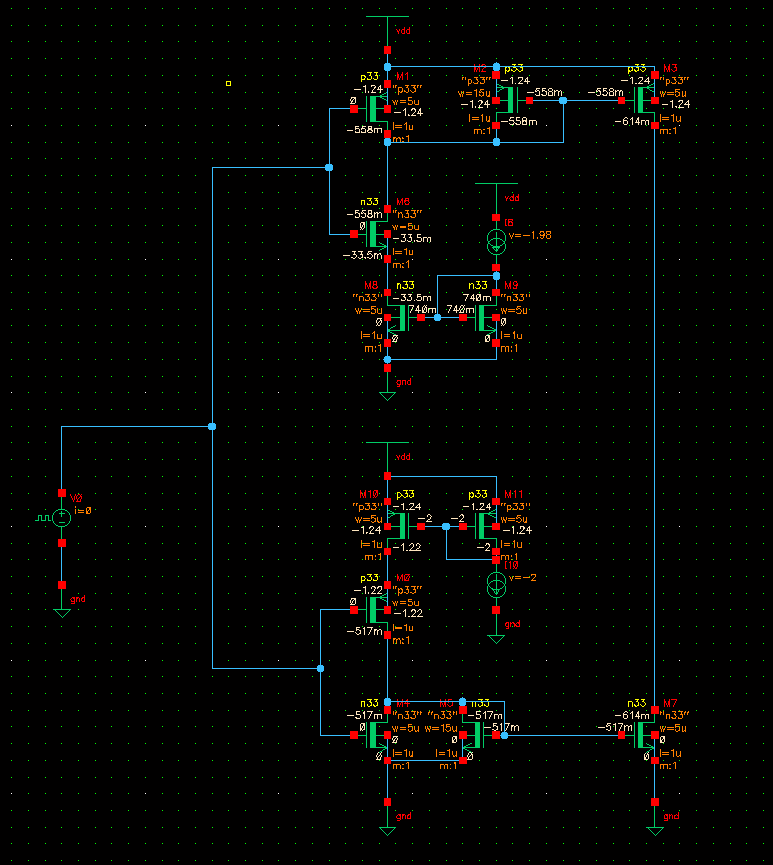 请教一下,我在电路中遇到过这种结构,感觉像是两个带电流源的反相器再并联组成一个反相器,但是仿真时输入家脉冲信号,输出貌似也没有什么电压输出啊?只有一些电流的尖峰,不知道这种电路到底做什么用的?