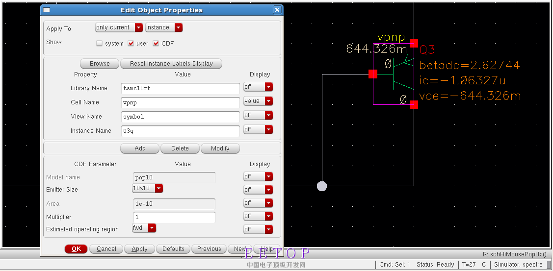 我在仿真一个基本的带隙基准的时候不知道三极管怎么设置,也不清楚里面的参数是什么意思。求助前辈