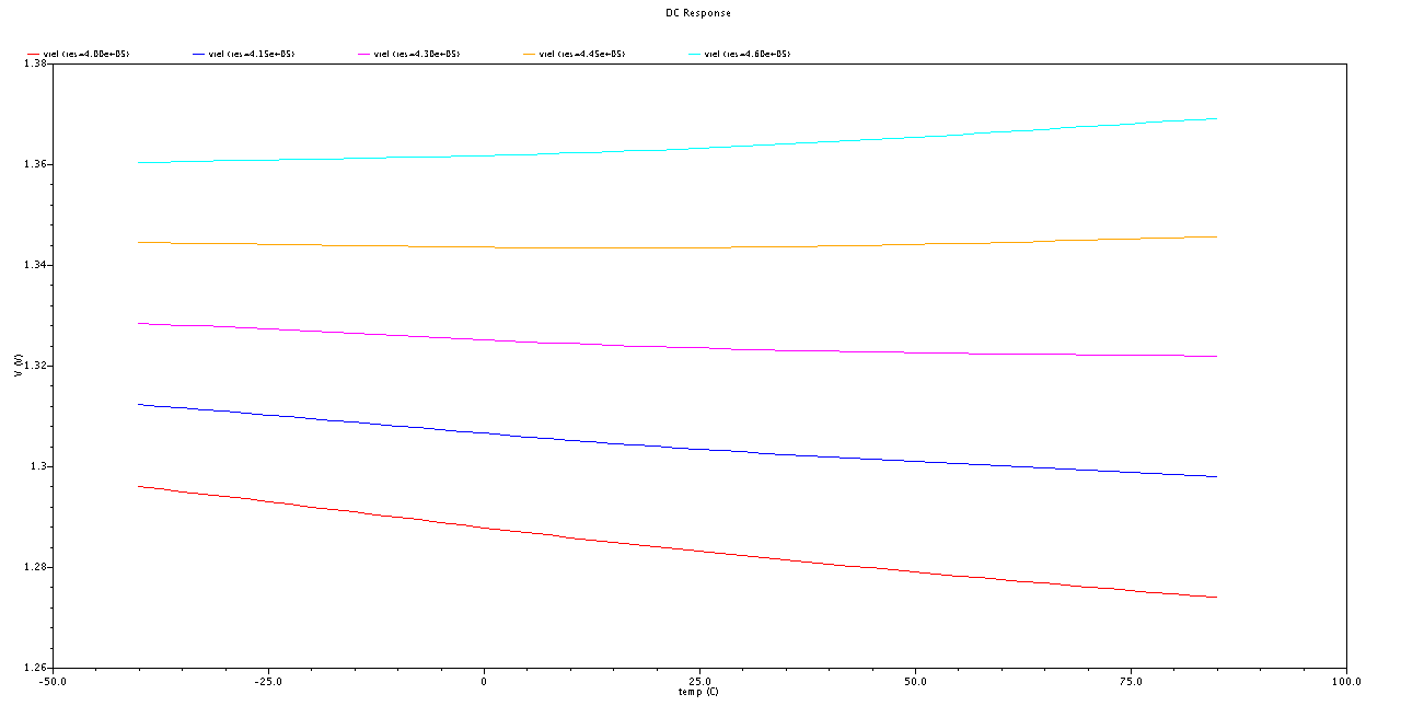 后面我上论坛求助了,结果有个大神回答了,他说是因为Vbe的温度系数是斜向下,而电阻的温度系数也是斜向下。这样两系数叠加后会造成影响。我后面也测了P管的温度系数,结果也是向下,这样在图中斜向上的温度系数曲线只有不同的双极型三级管间的温度系数了。我觉得斜向下的温度系数有点大,应该要调小它。最后我调P管的宽长比调到最大,不再影响电流,尽量避免影响电路,最后它的开口可以向上了。但是它的输出电压比正常的输出电压低了。我工艺用的是SIMC18的。顺带问下小编,可否有提高输出电压的方法。