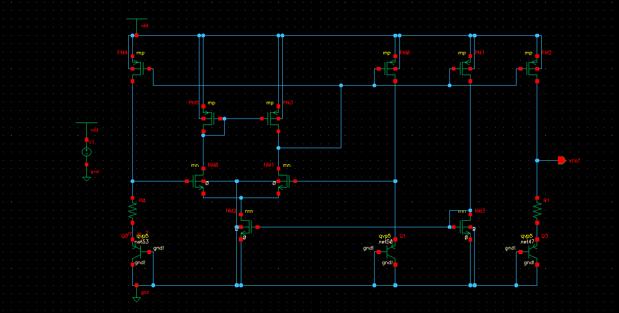 如图为何乐年书上第八章的原理图,参数也照书上给的参数设置。书上给的方法是按图连好后直接dc 温度扫描,然后通过改变2个电阻值来不断优化vref对温度的输出图,通过参数扫描的方法可以得到还不错的输出曲线。