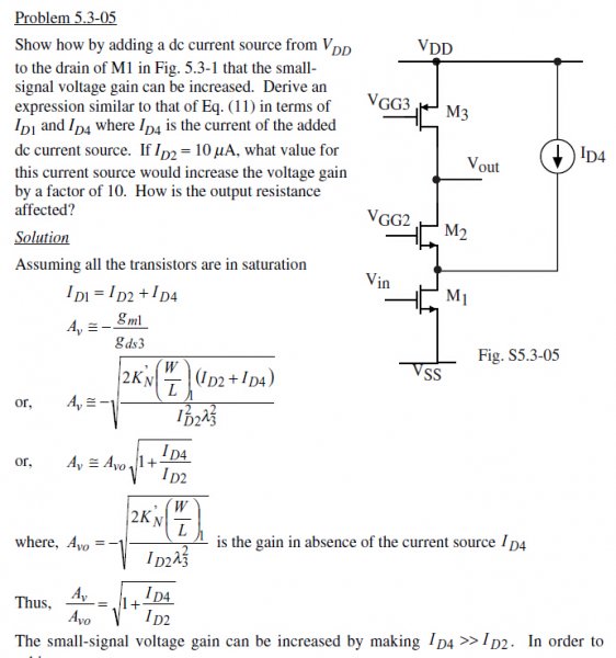 对于Razavi书上,并联Id5=0.8*Id1,Id3=0.2*Id1时,增益提高5倍。分析:Razavi采用给定|Vgsp-Vthp|的方式,也即是在并联Id5后M3尺寸会重新调整,以确保固定的饱和电压。而Allen所述暗含“W/L固定不变”的意思。前者在并联电流源后是分担了部分负载电流;后者这是将电流源电流增加到了M1上。“Razavi”公式计算:用gm=2*I/(Vgs-Vt) (因为是W/L不变)带入Av=-gm1/gm3.可得:Av=Av0 * I1 / (I1-I5)。Av/Av0 = I1 /(I1-I5)。显然公式不同于Allen所述情况!!!当Id5=0.8*Id1时,有Av=Av0*5。关键点:注意变化的是什么不变的是什么;★谁的电流保持不变。