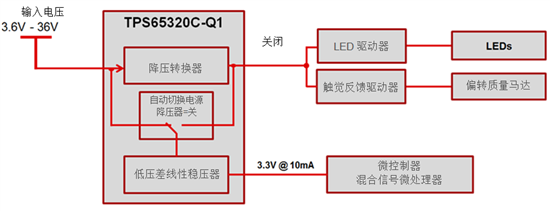 以带触觉反馈的LED顶灯为例。该设备的供电系统要求一个5V轨道同时给LED驱动器和控制着偏转质量马达(ERM)的触觉驱动器提供电能。LED和触觉驱动器均为电流密集型设备,对电流的要求大约为2A。使用降压转换器是提供此类电流的最佳选择,这是由于它能实现高效的电流转换,以保证系统在此荷载下不会出现发热现象。汽车ECU的核心组件是一个电压为3.3V、但电流需求量仅为150mA的微控制器(MCU)。当汽车熄火后,尽管该MCU可以切换到待机省电模式,但因为还要处理通讯与唤醒功能,因此不能彻底关闭。