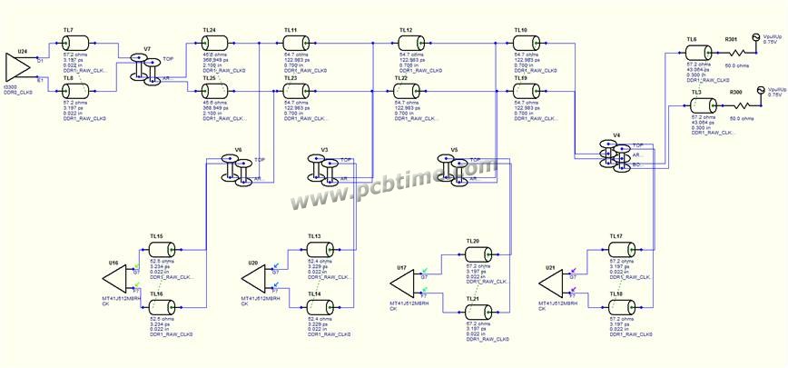 下面是一个简单的DDR3时钟一驱四的拓扑,时钟频率为500MHz: