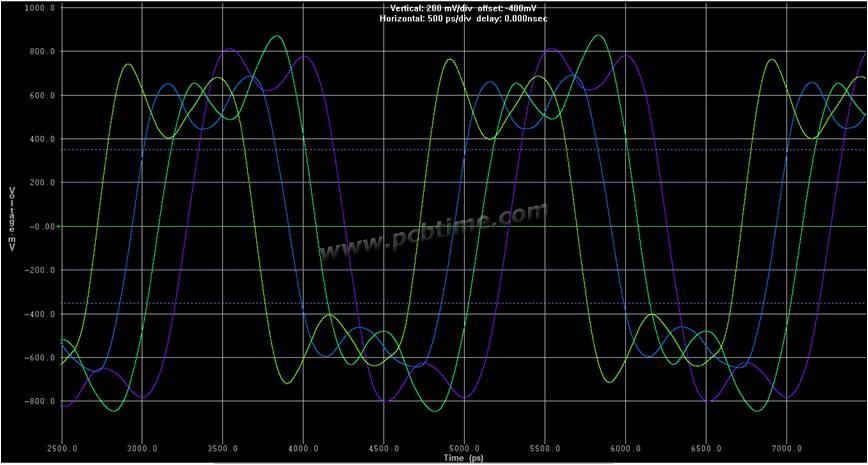 回想一下前几节说的,500HMz的时钟信号频域分量主要在500MHz,1.5GHz,这几个频率分量的四分之一波长分别为3000mil,1000mil。而我们当前拓扑中两两之间1500mil,500mil的线长很容易就凑成了四分之一波长,谐振最严重的长度。