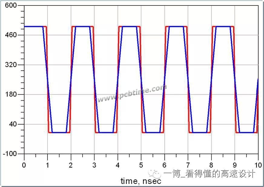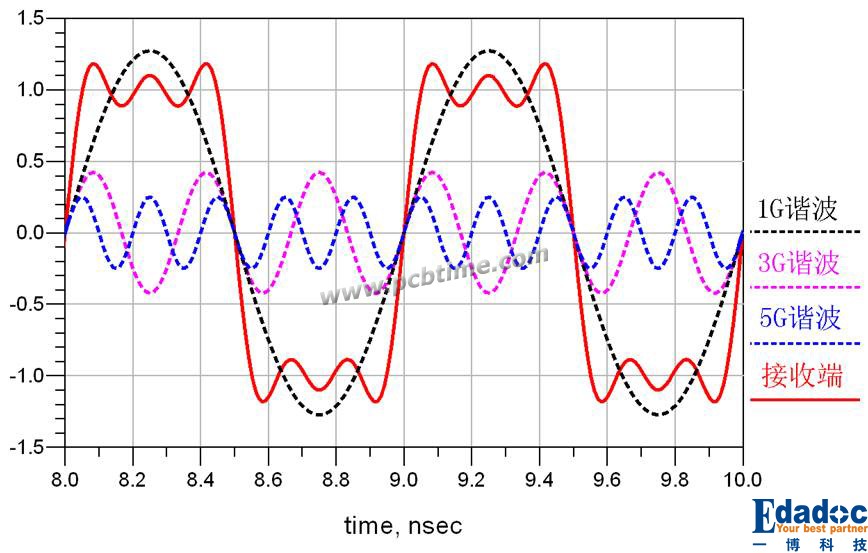 五倍频谐波合成一个波形,上升沿时间为信号周期的十分之一,符合我们一切对信号完整性的预期。