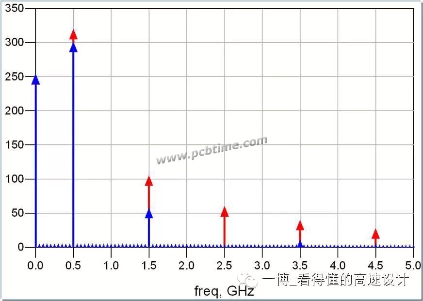 这是两个频率为500MHz的信号,他们周期相等,幅值也相等,但是上升沿不一样。很明显,上升沿较抖的红色信号直到9倍频处还有较为明显的频率分量,而上升沿较缓的蓝色信号在三倍频以后的频率分量就非常少了。