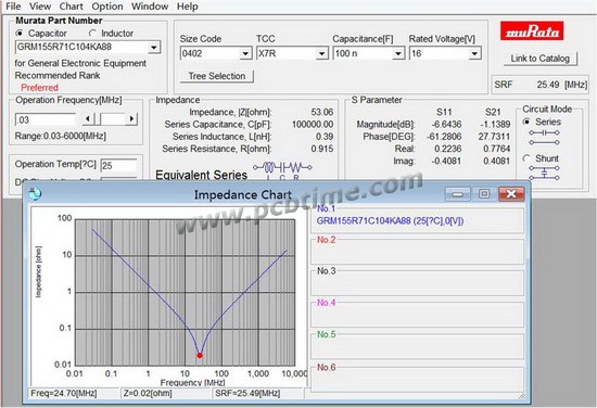 平常对ESR的关注不多,其实ESR也是非常关键的一个参数。不少人对ESR会有一些误解。首先,ESR不是一个常数,是随着频率而变化的。图1的Murata工具里面看到的串联电阻(Series Resistance )值,不是我们常规理解的谐振频率点的ESR,后面的等效电路仿真的时候需要注意这个细节。图2是这个电容的ESR随频率变化的曲线。谐振频率点的ESR值,决定了电容阻抗曲线的最低点。这个值在电容设计的时候也非常重要,一般来说,小尺寸封装的小电容,谐振频率点的ESR值一般较大。