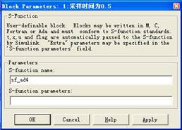 sf_ad8、sf_ad16、sf_ad32的S函数类似于sf_ad4,不同的就是采样时间的个数和ts的采样时间和延迟矩阵。调用S函数时首先将所需的S函数模块拖入调用模块(Simulink->User-Defined Functions->S-Function)并设置S函数的参数,参数设置对话框如图1所示。