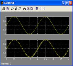 选择采样函数为4,则A/D转换的采样时间为0.0625,选定输入信号分别为正弦波和随机波。运行此仿真系统后的结果如图3、图4所示。