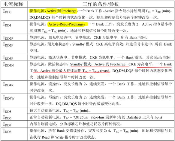 以上对sdram类器件的基本操作做了简要描述,这样对计算该类功耗计算起到了非常好的撬动作用。计算内存电源消耗的最重要的参数是操作电流Idd参数,这些值在标准的内存芯片参考手册上都可以查到。下面的列表介绍了 DDR 内存芯片的各种Idd电流的具体含义: