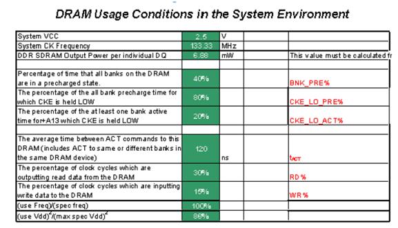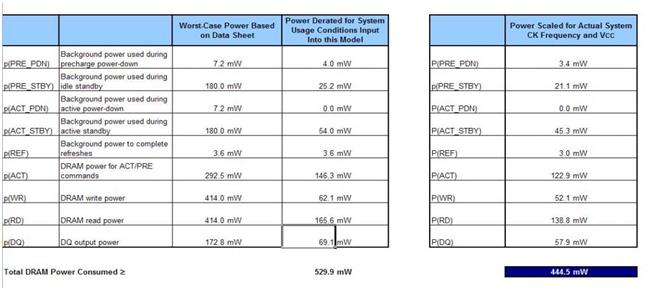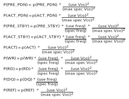 需要注意的是,芯片厂商的Datasheet上提供的数据通常都是在比较苛刻的条件下测量的结果比如VDD是工作在额定最大电压下(对DDR来说一般为2.7V)。遇到这种情况我们就要采取一些处理措施,办法就是根据实际电压和频率的变化,对计算的结果通过乘上变化因子进行调整: