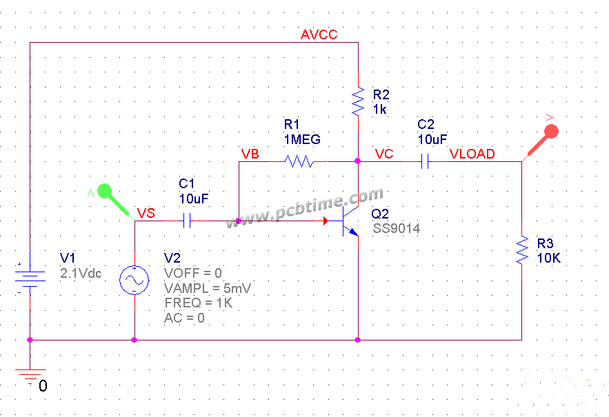 幫你仿真了 9014 放大電路,基本上沒問題。因為不知道你的 AVCC 電平是多少? 就假設2.1V。