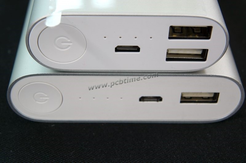 在MicroUSB的选择上,小米16000mAh需要承受长达9小时5V 2A(10W)大电流的冲击,发热和牢固性面临了挑战。这里小米选用了具有四个固定柱的“牛角”MicroUSB座子,深插入PCB中,提升了长期插拔稳定性。