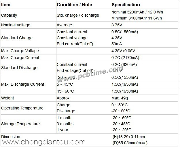 LG这款新品电芯型号为LGABE11865,外观为深紫色PVC封套。官方PDF中标称容量为3200mAh(12.0Wh),最小容量为3100mAh(11.6Wh);充电截止电压为4.35V(±0.05V),放电截止电压为2.75V;电芯内阻在50毫欧以下,最大放电电流为4.65A。