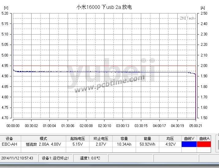回到小米移动电源铭牌所标注的5.1V1A输出条件下90%转换率后的容量为10800mAh,实际测试结果超出了标称值。