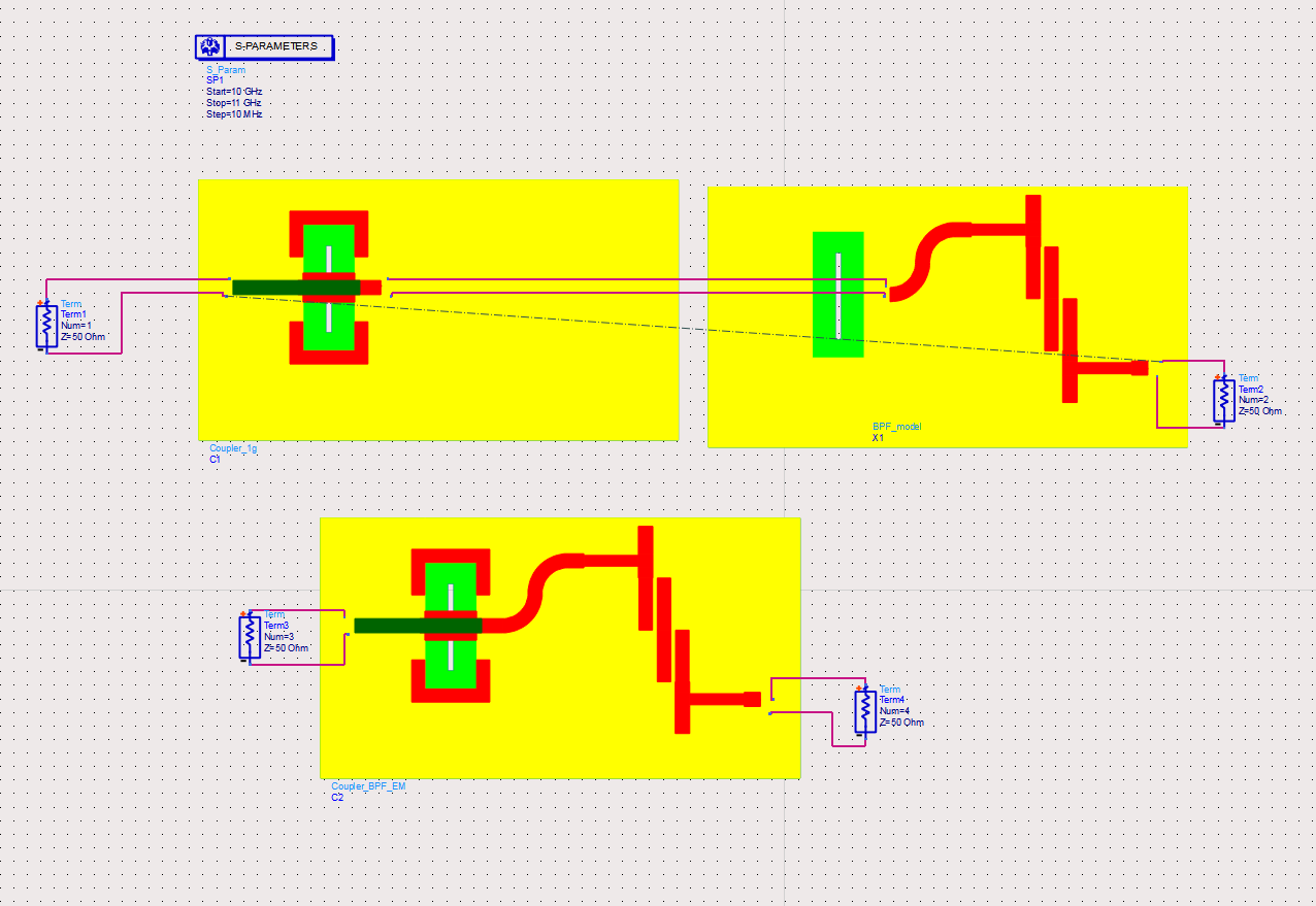 I've simulated coupler and am satisfied with the results. I've also simulated a bandpass filter (albeit, on a single-layer board) and am satisfied with it. I stack them in ADS schematic (coupler and bandpass filter share a ground) and S-parameters add linearly. Next, when I copy and paste those two structures together, I get distorted signal, even though input and output impedances and matched to 50Ω relatively well.