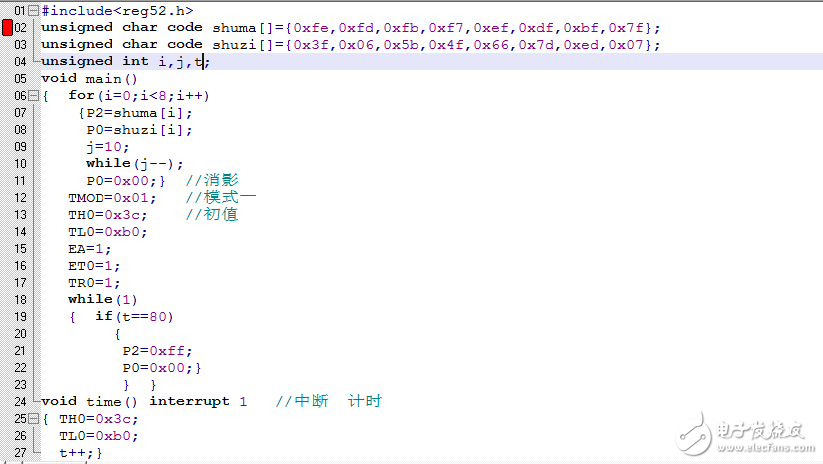 可是编译没错,就是下载到开发板上发现一个数码管都没亮,当我把中断计时那部分程序删掉后,数码管又可以亮,只是四秒后不能灭 ,这是为什么呢?各位大神快帮帮我吧,我都弄了大半天了