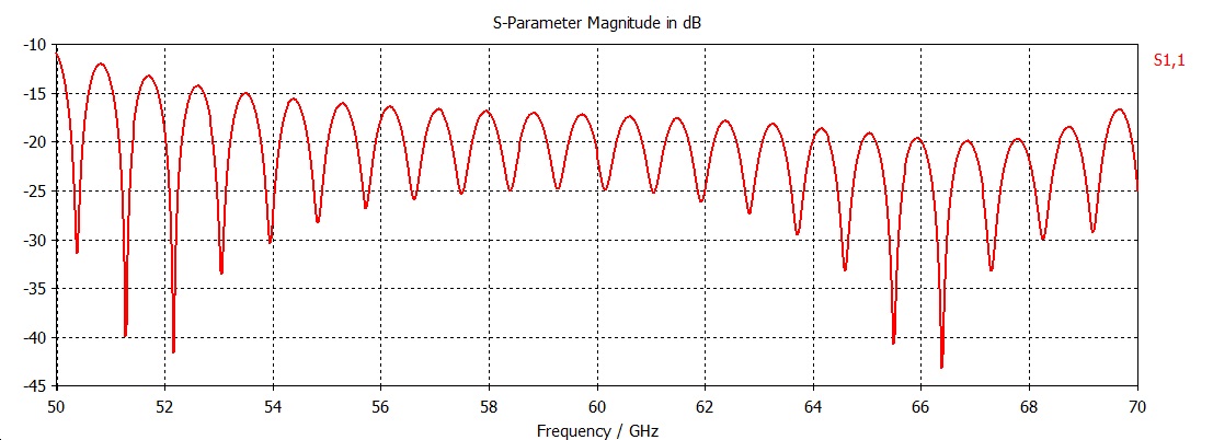Hello everybody. I have designed a waveguide to microstrip transition for 60 GHz (using CST) that shows very good matching, when the length of PCB component (microstrip line) does not exceed 5-7 mm. If i increase this length the parameter S11 starts to oscillate as you can see on picture. Is this related to surface waves or something else? any help would be great