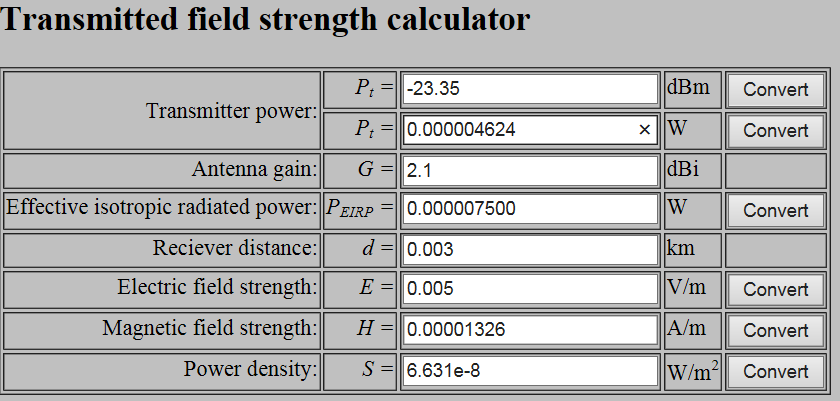 Could you tell me how did you get those values of 5 μW with dipole gain (2.1 dBi) for 5 mV/m @ 3m?