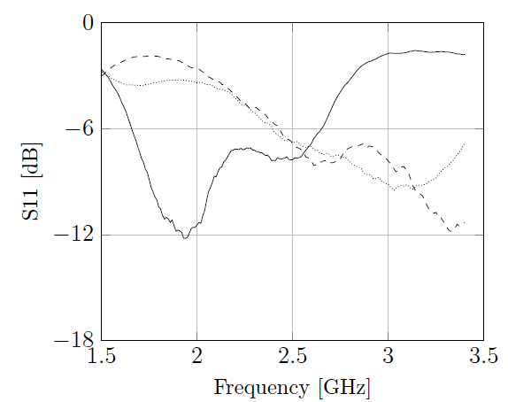 dotted: Large loop in parallel with the small loop and the variable capacitor (to obtain resonance at around 2.5 GHz)