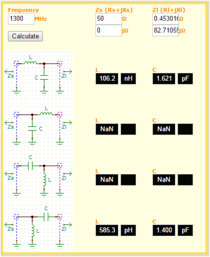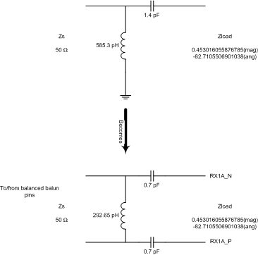 Am I right in setting the Zs impedance (balun) to 50+j0? Am I right in matching to 0.453+j82.711? Is the conversion from single ended match to diff match circuit correct?