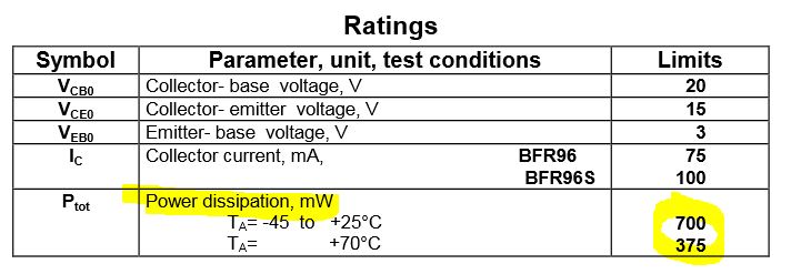 Find a cheap 2N2222A (1.8W) or 2N2219A (3W) and it will work much better for this application than BFR96.