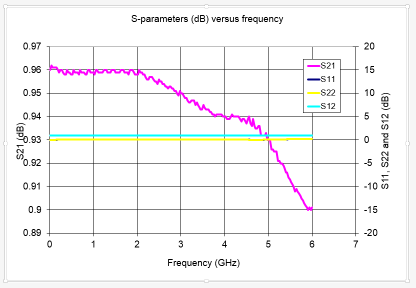 We downloaded the S-parameters for this passive reciprocal device from the Hittite web site, which is very friendly, and provides S-parameters in "S2P" format. This is a nine column text file with some specific formatting in the header which you can ignore for now. The nine columns that you need are: