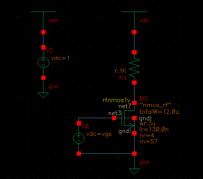 I want to check if the gate-source capacitance Cgs depends on bias voltage Vgs or not. I set up the circuit for simulation in Cadence as below.