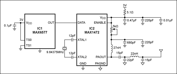 MAX6577 is a local temperature sensor that detects the ambient temperature at the device. The output of the MAX6577 is a square wave with a frequency proportional to temperature in units of Kelvin. The MAX1472 is the ASK transmitter and modulates the signal on to the carrier frequency of 315MHz.