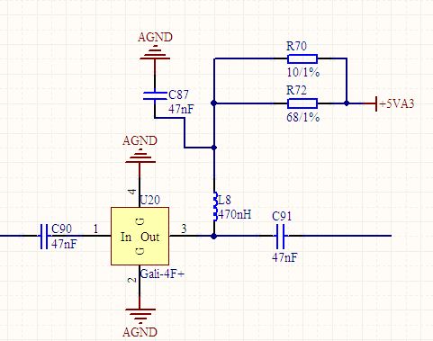 However, the question comes from the bias current change from board to board. I found that when I built the boards with the same resistor, the bias current of Gali-4F will change part by part. Sometimes, the bias current (based on the measure voltage across resistor) could reach 60mA (specification is 50mA). So, I am wondering if this behavior is correct. Or, something of the design is wrong. Based on the mini circuit's datasheet, the operating bias current of Gali-4F should be constant across parts. But, I couldn't conclude that.