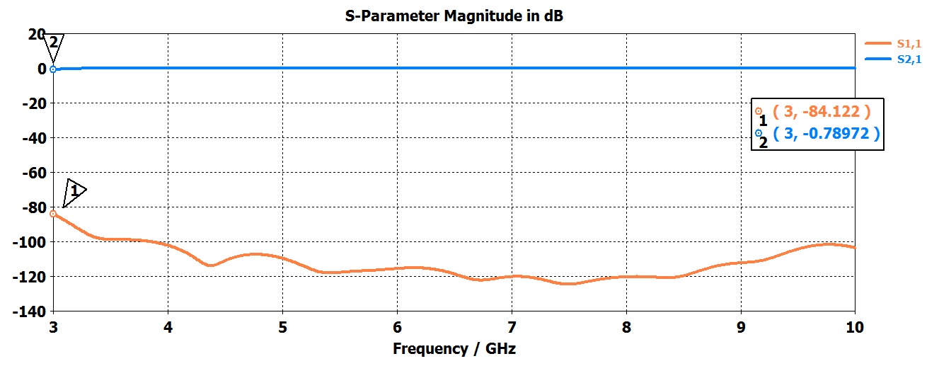 When I run simulation for simple rectangular waveguide in frequency range that includes cutoff frequency, I'm suppose to see the change in S-parameters, that show the cutoff behaviour of the wavegude. My S21 looks ok, but S11 is not showing what I think it should. Below cutoff frequency S11 should be around 0 dB and above it should drop. Am I wright? Can anyone tell me where could be the problem?