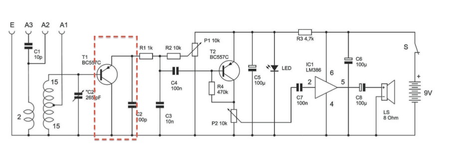 removes RF splits. T2 is an AF preamplifier for the integrated amplifier IC1. The AF stage also uses