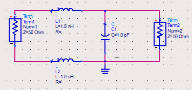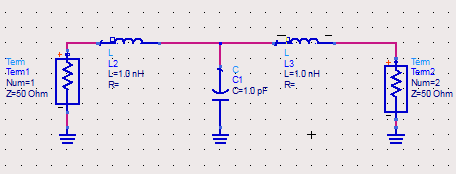 Onr branch includes L1, and shunt C1/2, then simulates with both 50 ohms terminal.