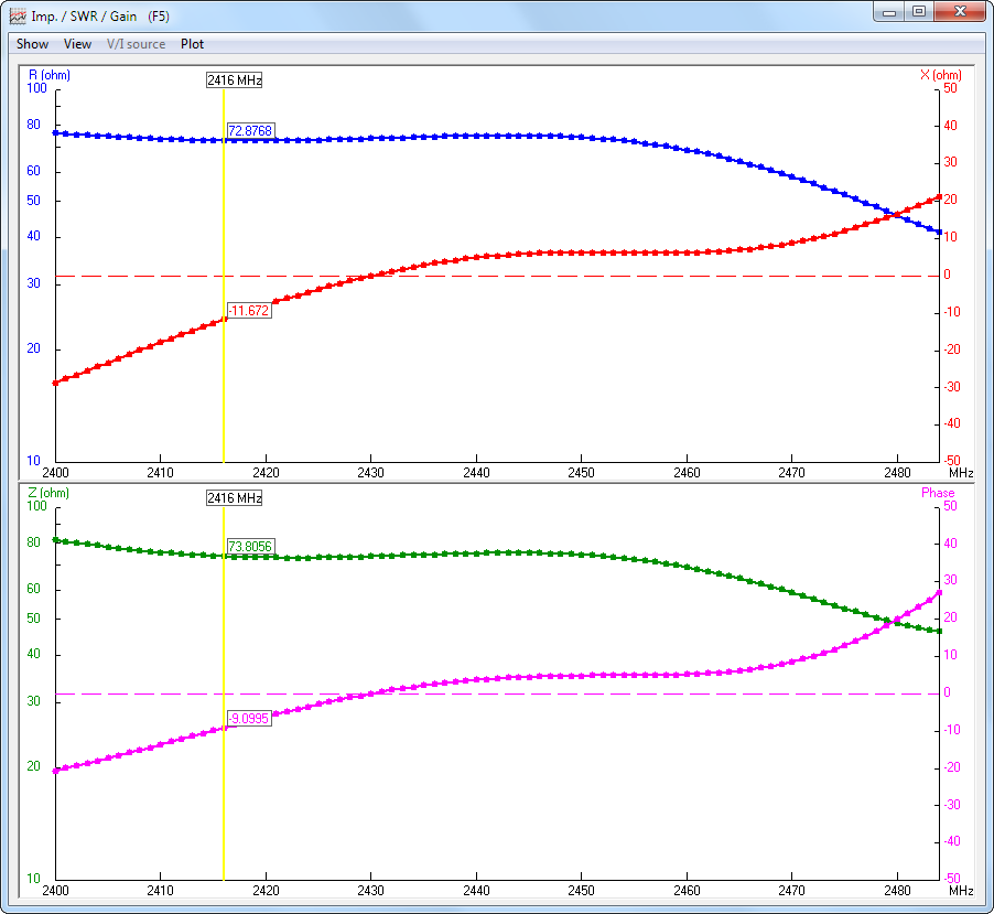 I build a 15dBi Yagi antenna for wifi purposes and I have done some measurements which include plotting the S11. But now I want to turn these values into complex impedance (read: Zin). The formula to do this is: Zin = [(1 + S11) / (1 - S11)] * Z0, in which Z0 is 50 ohm. Now, as I tried this formula out on my theoretical values in my 4Nec2 design I found something strange. If I'd take a theoretical S11 value at a certain frequency it wouldn't match the theoretical Zin at the same frequency. Example: