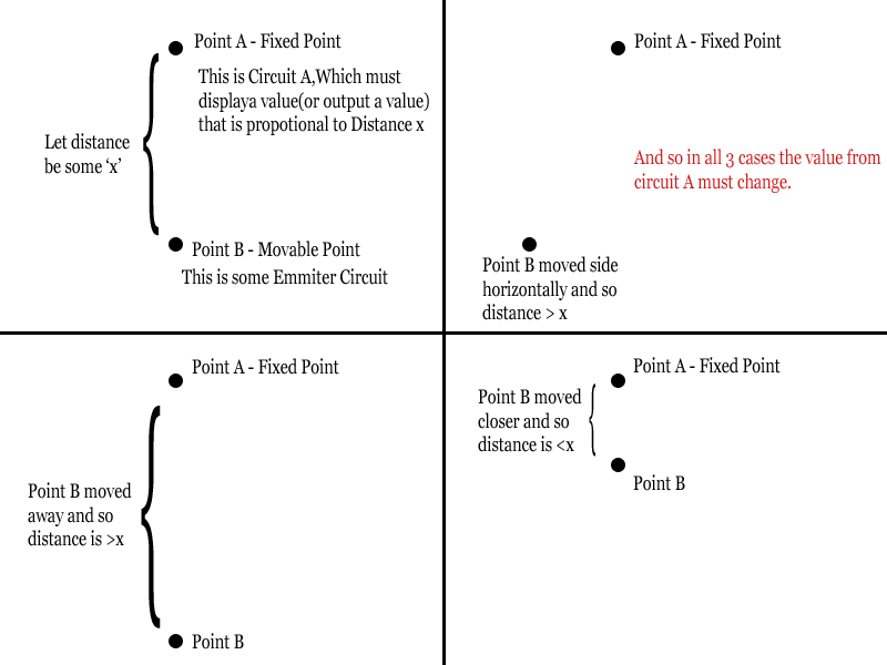 A must get the signals from B and must display (or output a value to Micro Processor) which is proportional to the distance between A and B.