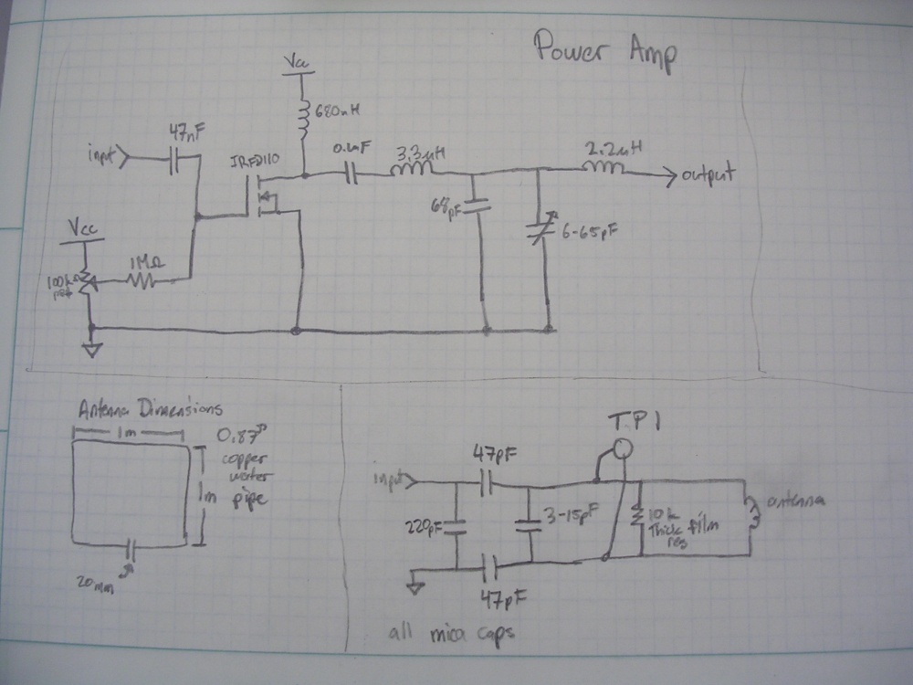 I have not been able to the the signal large enough across the antenna. I measured from TP1 on the attached schematic and the most I have gotten was 60Vpp. I believe that I should get alot more. The impedence from the antenna is about 70 ohms and it is designed for 50 so I am wondering if that is a problem?