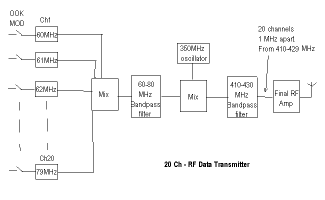 This could be done like this. First make twenty oscillators, 100Khz apart above 5MHz. Modulte them individualy with your signal.Combine outputs of all frequency.Filter carrier and upper side band.You will get your 20 channels in 5-7MHz. Now modulate your uhf oscilator with this signal.The output will be above and below 5-7MHz of yor uhf carrier frequency. Filter upper side band for further amplification and output.You will get your 20 channels above 5-7MHz to your uhf carrier frequency.