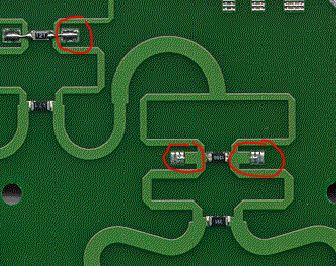 With the circuit simulator, we had identified places where the output isolation can be tuned by extra capacitance to ground. In the layout, we added small copper segments that could be connected as needed, to add that shunt capacitance.