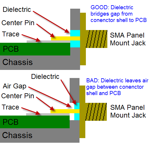 I need to mount a Panel Mount SMA connector to a chasis, then solder the conductor to a PCB trace.(800MHz)