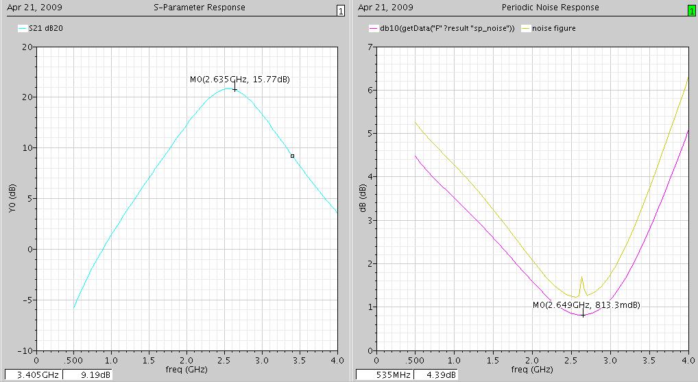 I did both the analysis follow the SpecterRF_UserdGuide_2003 realsed by Cadence.In fact, I know not so much about the pnoise and sp analysis settings. Could someone explain the results for me or show me how to do the correct analysis of the LNA NF.