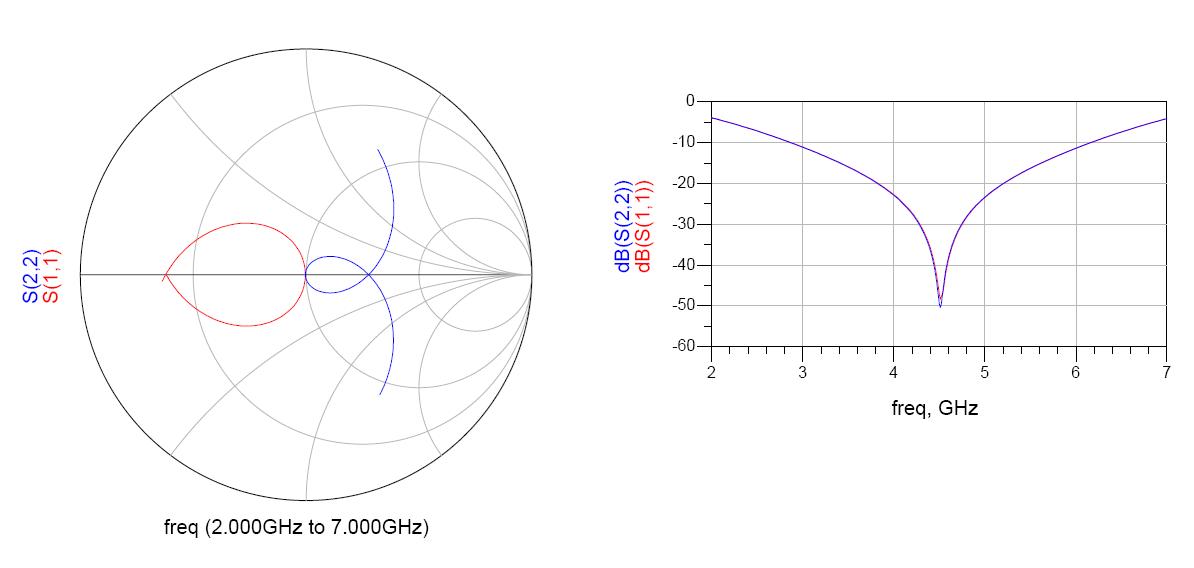 A Marchand has good return loss over only an octave. It is only perfectly matched at one point. I changed a few dimensions and here is one tuned to 4.5 GHz.