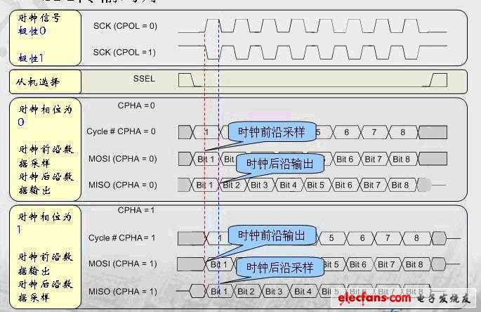 其中,CPOL是用来决定SCK时钟信号空闲时的电平。CPOL=0,空闲电平为低电平,CPOL=1时,空闲电平为高电平。CPHA用来决定采样时刻的,CPHA=0,在每个周期的第一个时钟沿采样。CPHA=1,在每个周期的第二个时钟沿采样。