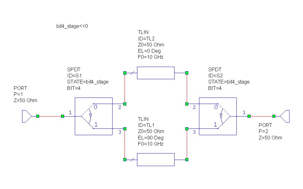 Phase shifter schematic - This is an ideal 6 bit phase shifter. The subcircuits in the chain have an ideal switch and ideal transmission lines to generate the phase shift. Each subcircuit has a different phase shift that, when properly combined, give all 64 possible phase states. Each subcircuit has its bit parameter exposed so it can be passed in from the top level schematic. In the schematic there are various ways that the current state is chosen and these will be explained in more detail later. In each subcircuit, the SPDT can decode a state number into individual bits and choose the proper bit to control the switch. For example, in this 6 bit shifter, there are 64 possible states. If you decode this base 10 number to a base 2 number you have 6 bit locations (E.g, 0 in base 10 is 000000 is base 2, 1 In base 10 is 000001 in base 2, and 63 in base 10 is 111111 in base 2). On the SPDT model, you specify a base 10 state number and then which bit in this number. Each shift section is getting the same state number but the bit setting on each switch is different for each subcircuit.
